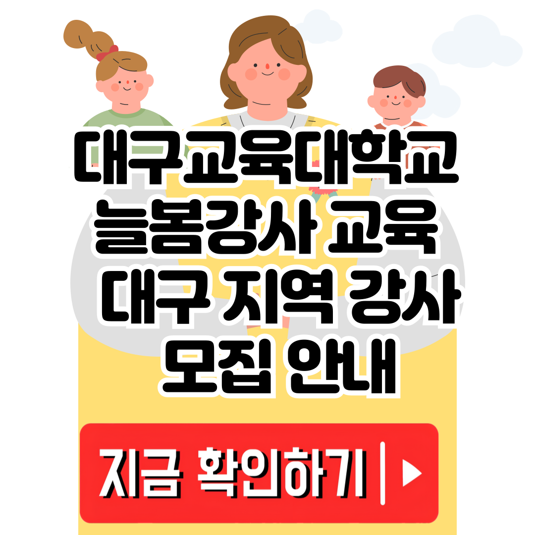 대구교육대학교의 늘봄강사 연수는 연 2회(여름·겨울방학) 진행됩니다. 정확한 일정은 대구교육대학교 평생교육원 홈페이지에서 확인할 수 있습니다.
