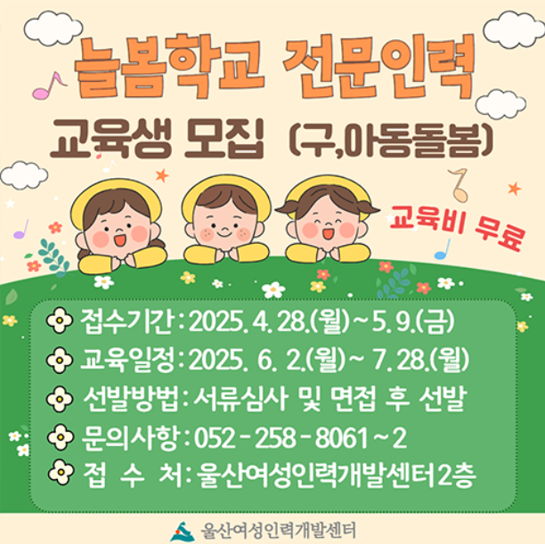 아동 돌봄 분야 취업을 준비 중이신가요? 울산여성인력개발센터에서 운영하는 늘봄학교 전문인력 양성과정이 2025년 상반기 교육생을 모집합니다. 이번 교육은 전액 무료로 제공되며, 교육 수료 후 관련 분야 취업 연계도 가능합니다.