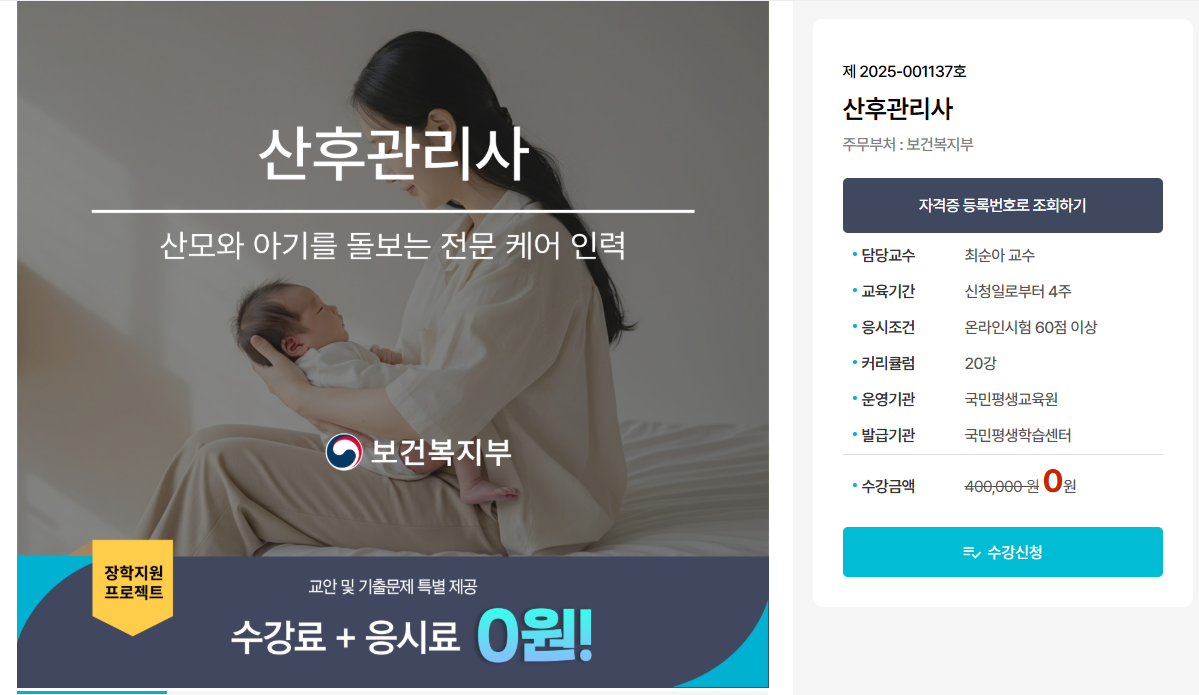 | 과정 내용 | 신생아 관리, 모유 수유, 응급처치, 서비스 태도, 직업 윤리 등 |